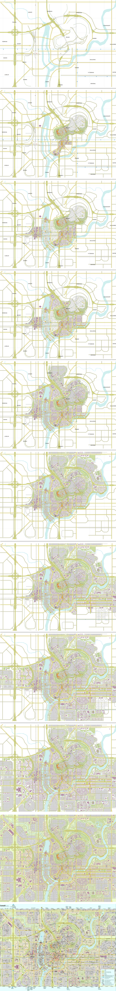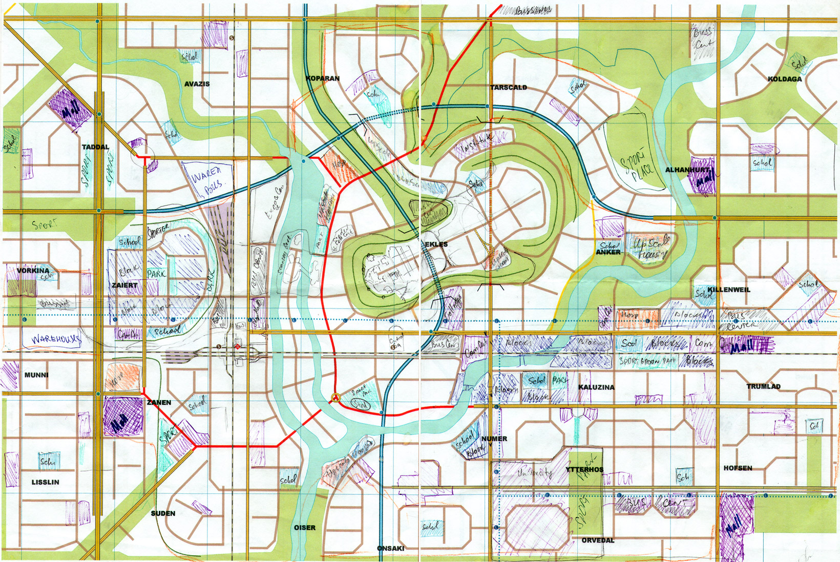 Drawing map of Scanseik was intrigued task for me. Interesting relief and developed infrastructure gave a good meal for my imagination. The entire map was done during 29 working days. The short video below and drawings on the right show how work was progressed. Before the beginning new map I make a sketch to lay the zoning areas and main large scale city objects out. This kind of sketch for Scanseik map is shown below.
